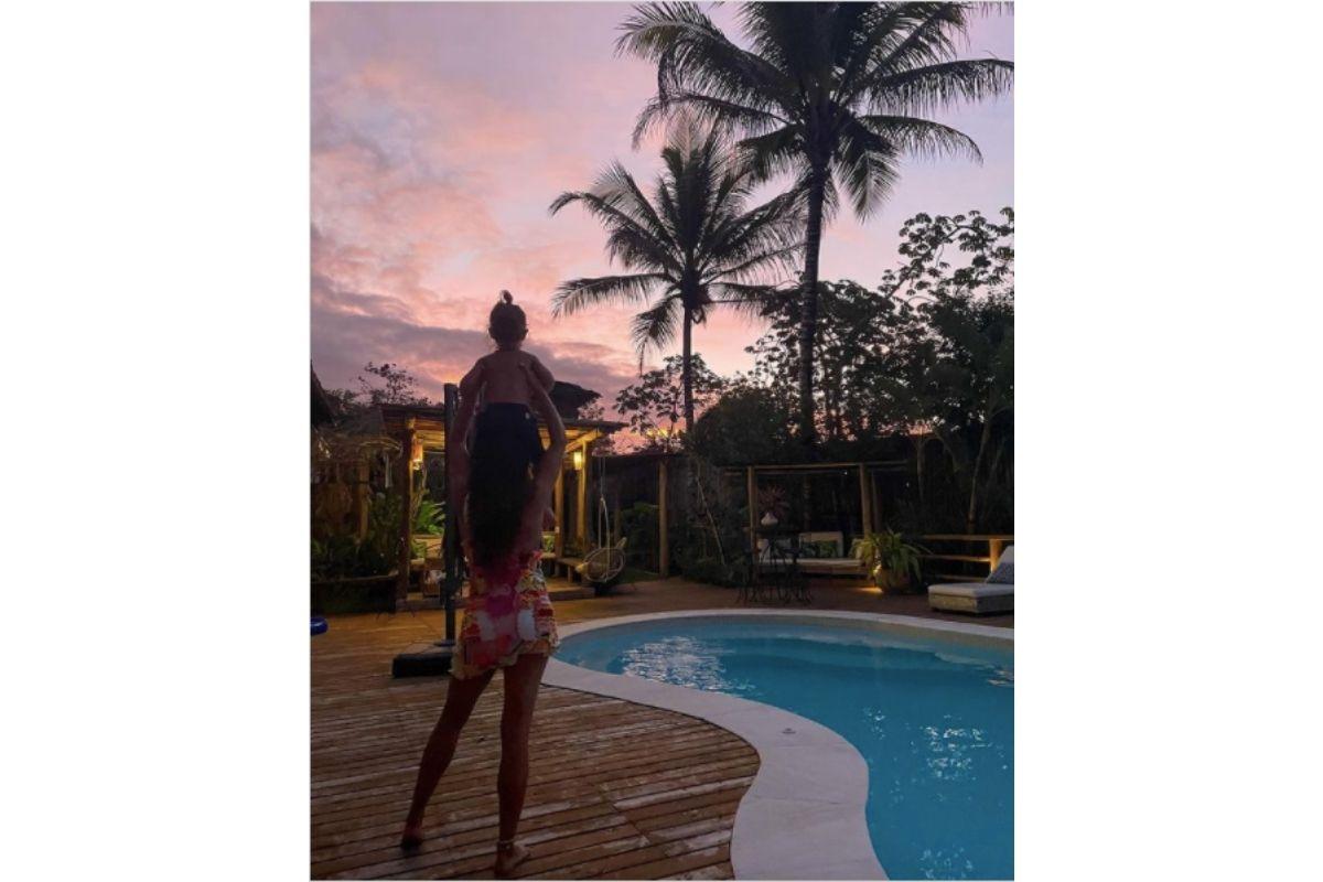 À beira da piscina e no próprio perfil das redes sociais, a mãe posou de costas segurando o menino, que está sentado nos ombros da atriz e se derreteu na legenda: “Do lado de dentro”.