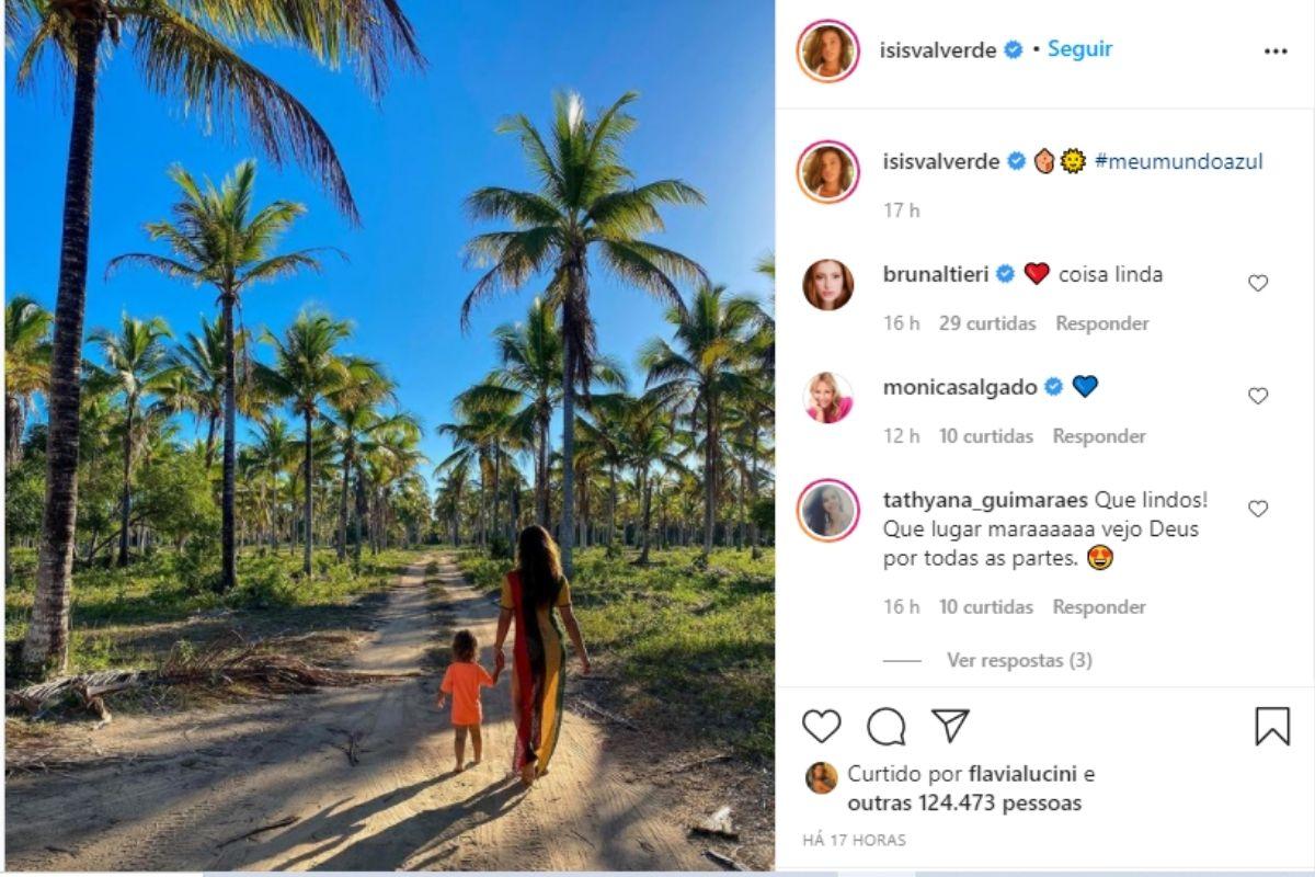 Isis Valverde surge de mãos dadas com o pequeno. “Meu mundo azul”, se derreteu na legenda da publicação. Diante da foto os seguidores não dispensaram os comentários. “Que lindos! Que lugar maraaaaaa vejo Deus por todas as partes”, escreveu uma. “Que foto linda”, disse outra. “Família maravilhosa! Lindo cenário”, ressaltou outra.