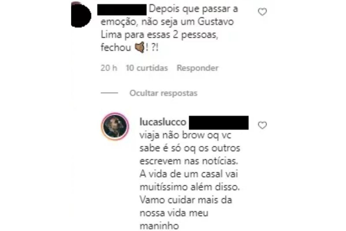 “Depois que passar a emoção, não seja um Gusttavo Lima para essas duas pessoas, fechou?”, escreveu o internauta. “Viaja, não, brow. O que você sabe é só o que os outros escrevem nas notícias. A vida de um casal vai muitíssimo além disso. Vamos cuidar mais da nossa vida, meu maninho”