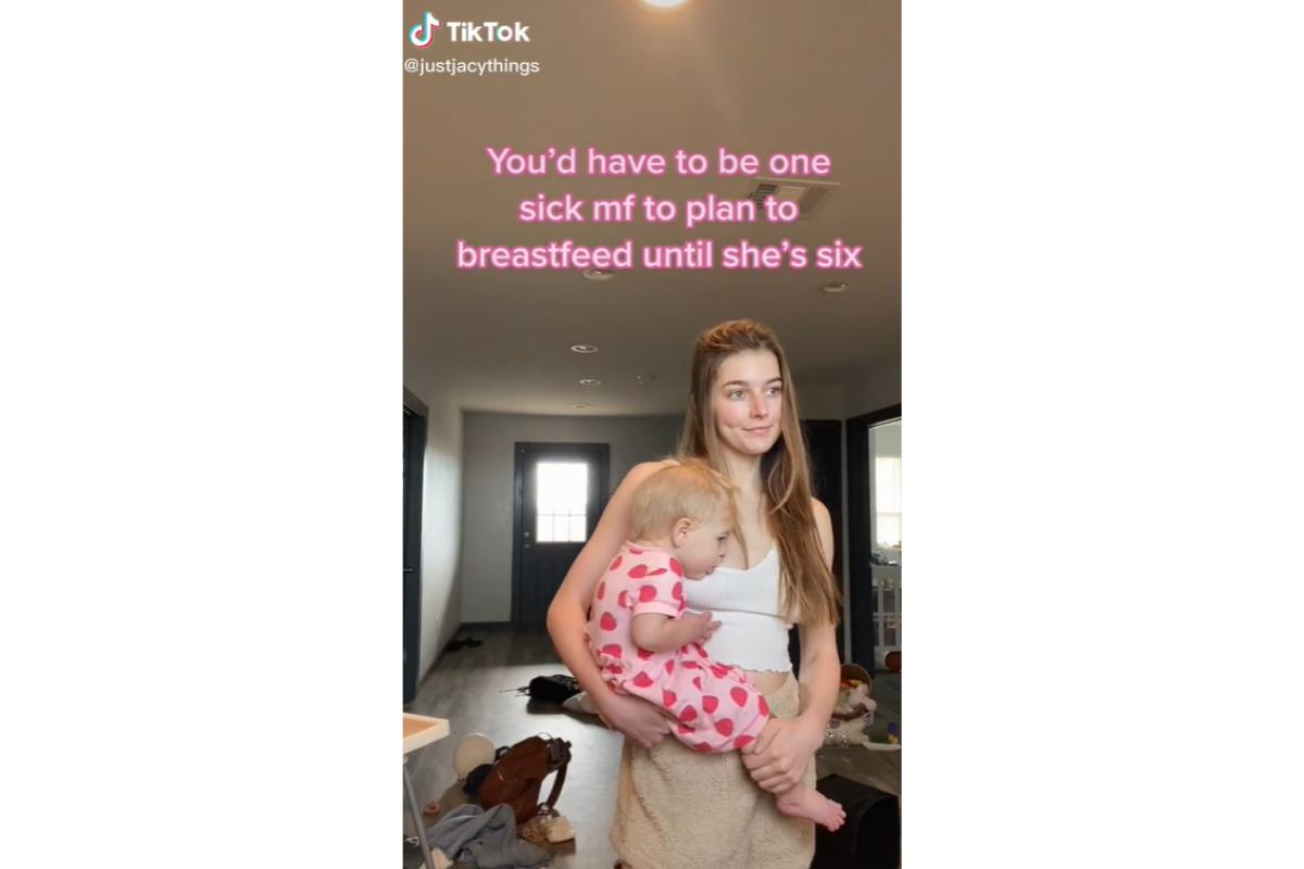 Foi através de um vídeo compartilhado no TikTok que Jacy comentou sobre o assunto. Por lá, a mãe de primeira viagem aparece amamentando Emmy, enquanto dá de ombros e debocha do comentário escrito na tela: “Você teria que ser uma filh* da put* doente para planejar amamentar até os seis anos”.