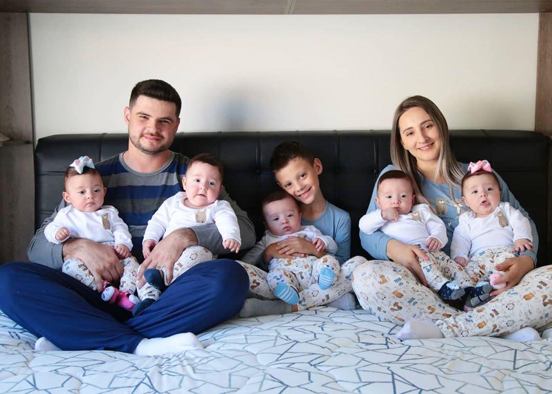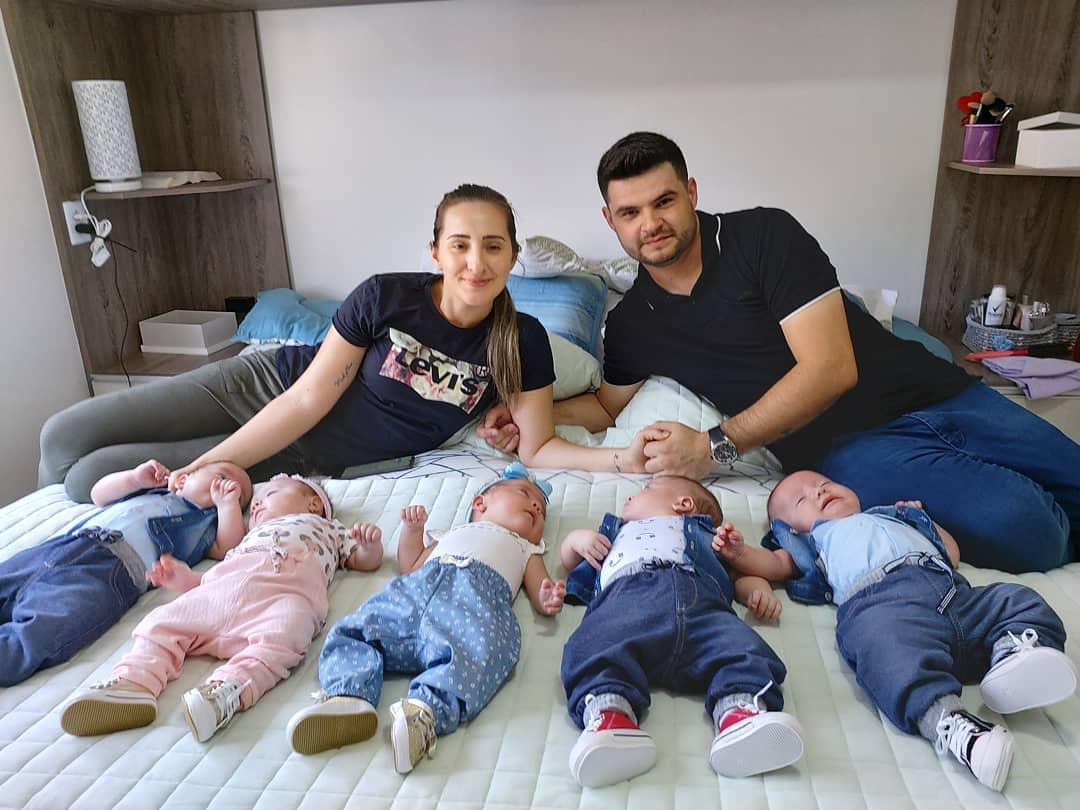 Anieli Camargo Kurpel e o marido Luis Fernando Araújo comemoram este Dia das Mães com os seis filhos durante a quarentena contra o coronavírus. O casal descobriu que teriam cinco filhos de uma só vez em abril de 2019 após a suspeita de que ela estava com um tumor no útero. Além dos quíntuplos, os dois são pais de Davi, de 6 anos.