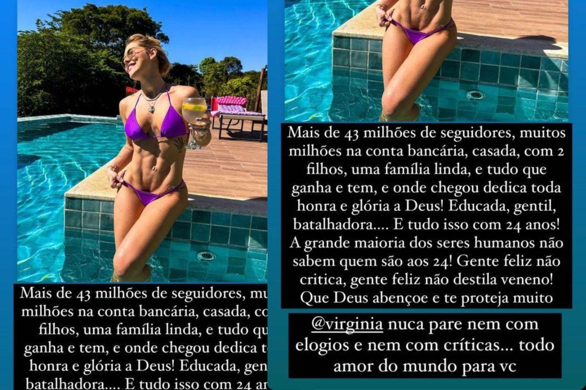 Maíra Cardi escreveu: “Mais de 43 milhões de seguidores, muitos milhões na conta bancária, casada, com 2 filhas, uma família linda, e tudo que ganha e tem, e onde chegou dedica toda honra e glória a Deus! Educada, gentil, batalhadora… E tudo isso com 24 anos! A grande maioria dos seres humanos não sabem quem são aos 24! Gente feliz não crítica, gente feliz não destila veneno! Que Deus abençoe e te proteja muito. Virginia, nunca pare nem com os elogios e nem com críticas… todo amor do mundo para você”.