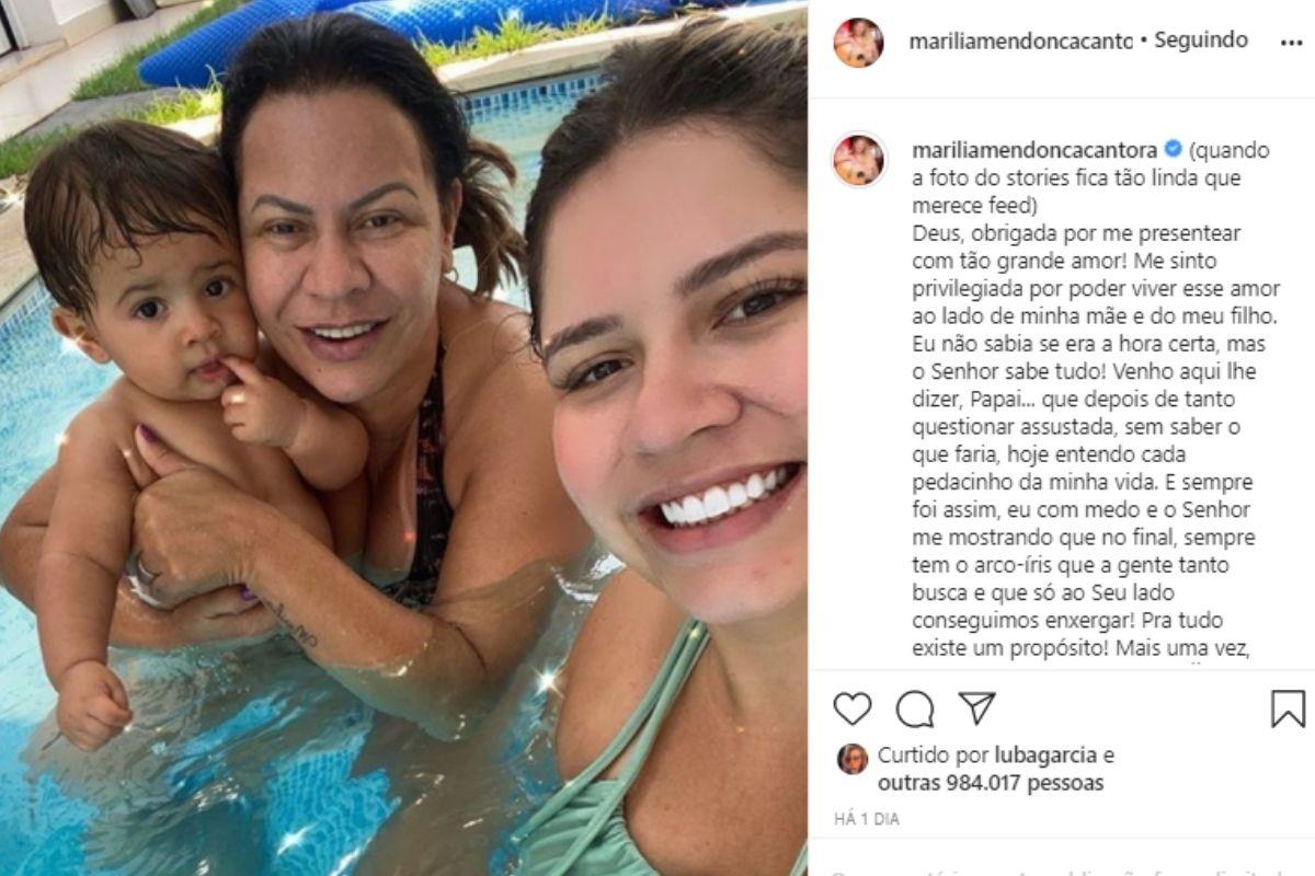 Marília Mendonça brincou com os fãs no último domingo, 20 de setembro, ao postar uma foto onde aparece ao lado da mãe e do filho, Léo, de 9 meses. A família, que apareceu dentro da piscina, recebeu vários comentários e elogios dos seguidores da sertaneja, mas um deles recebeu uma resposta super bem humorada da cantora. A admiradora escreveu: “Vou ficar desempregada Marília, me contrata” e a artista soltou: ““Eu estou desempregada também hahaha! Ex -cantora”.