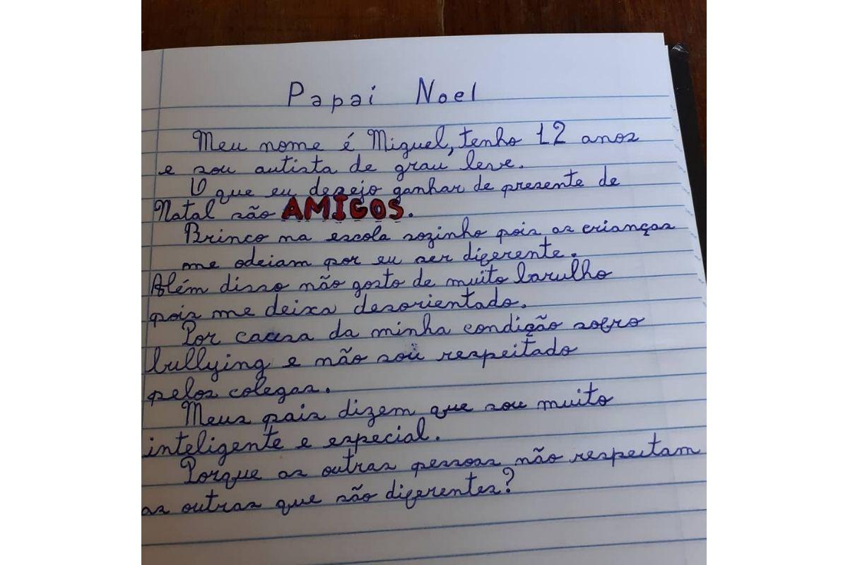 Na época, com 12 anos, Miguel escreveu ao Bom Velhinho para que a situação mudase: “Meu nome é Miguel, tenho 12 anos e sou autista de grau leve. O que eu desejo ganhar de presente de Natal são amigos”, ele disse logo no início da carta.