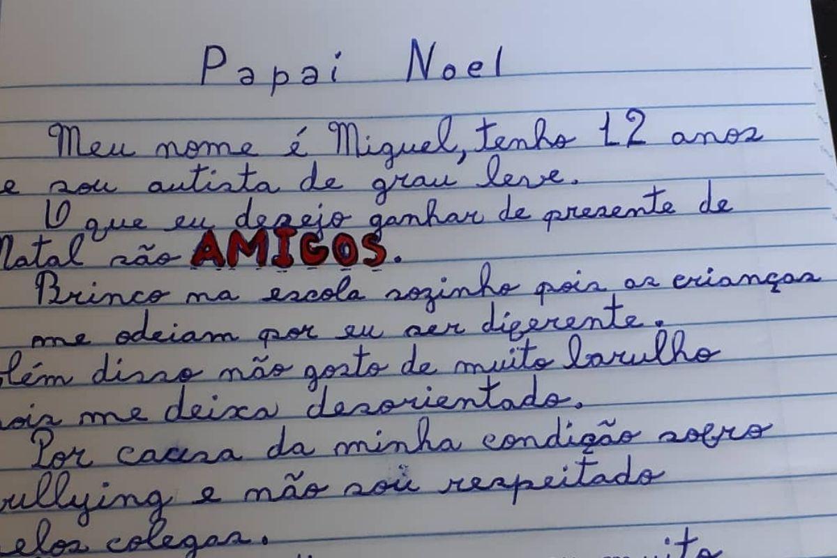 Na época, com 12 anos, Miguel escreveu ao Bom Velhinho para que a situação mudase: “Meu nome é Miguel, tenho 12 anos e sou autista de grau leve. O que eu desejo ganhar de presente de Natal são amigos”, ele disse logo no início da carta.