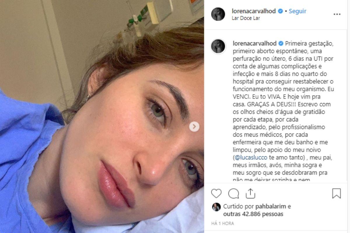 Nesta terça-feira, 29 de outubro, Lorena Carvalho compartilhou em sua conta no Instagram alguns detalhes sobre sua internação na UTI. Após sofrer um aborto espontâneo, a noiva de Lucas Lucco teve que lidar com uma perfuração no útero consequência.