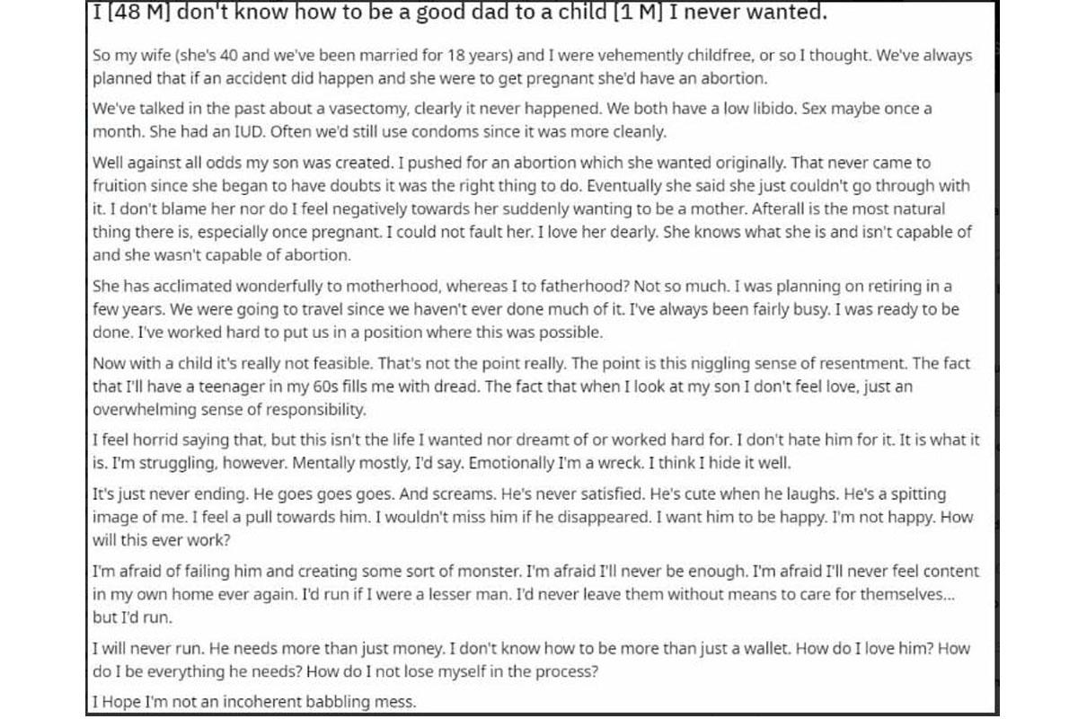Ele conta que a mulher depois desistiu do aborto e ele respeitou a ideia dele. “Minha esposa se adaptou muito facilmente a maternidade quando nosso filho nasceu, mas eu não me adaptei a paternidade“, desabafa. O pai se sente muito culpado por ter esses sentimentos.