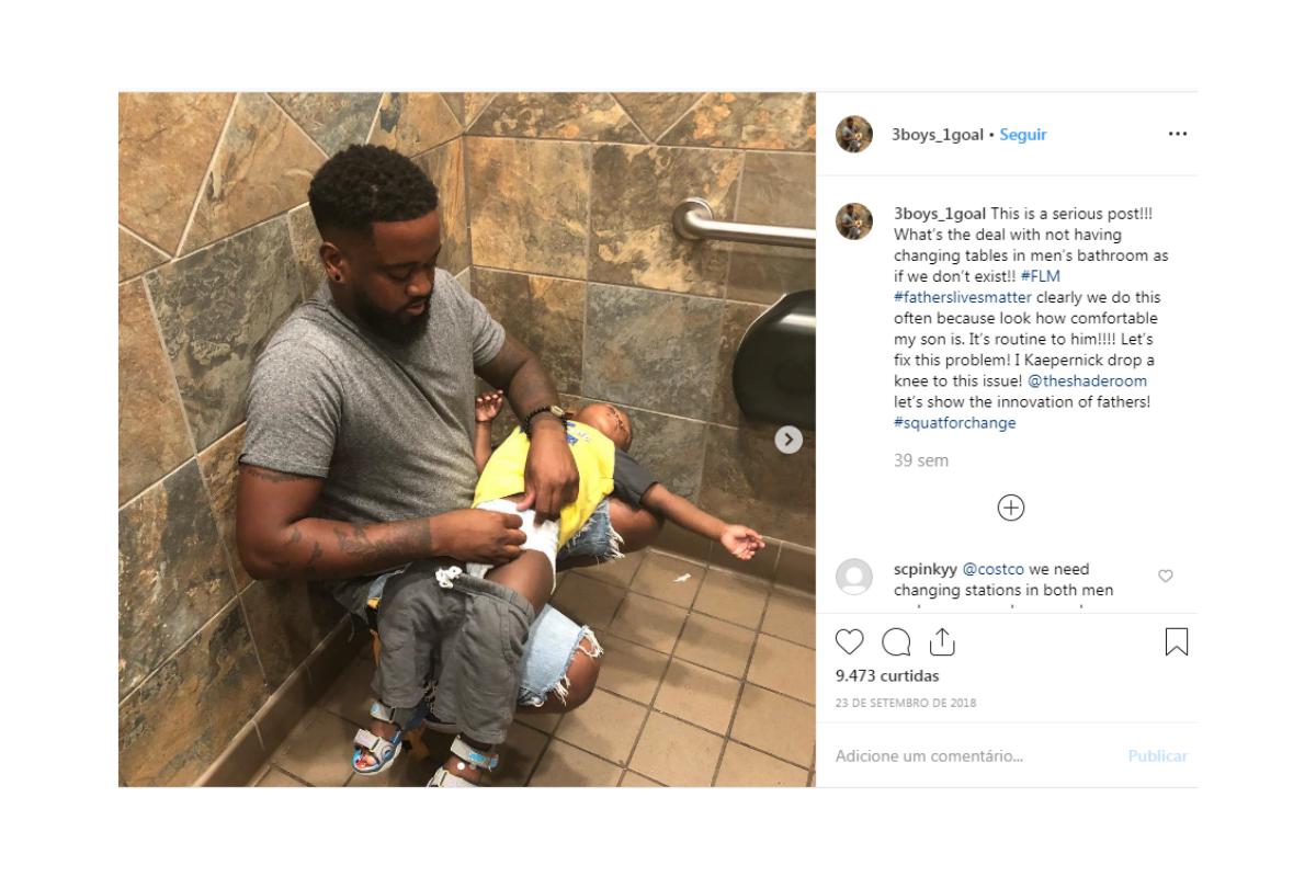 Na legenda da foto, ele escreveu um texto sobre a falta de trocadores nos banheiros dos homens, até porque não são só as mães que trocam fraldas, né? O post viralizou entre os internautas até chegar na Pampers, que teve a iniciativa de instalar 5 mil trocadores nos banheiros masculinos em shoppings.