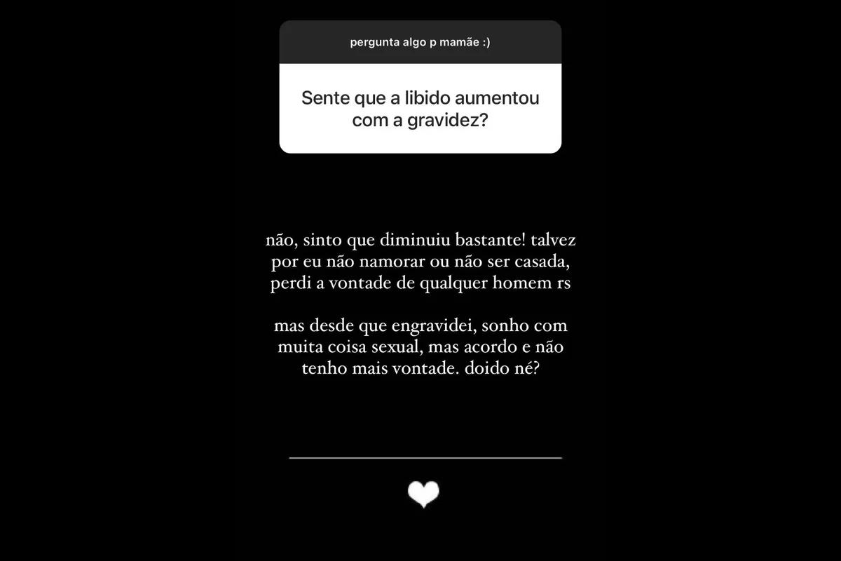 “Sinto que [a libido] diminuiu bastante. Talvez, por eu não namorar ou não ser casada, perdi a vontade de qualquer homem”, disse ela. “Mas desde que engravidei, sonho com muita coisa sexual, mas acordo e não tenho mais vontade. Doido, né?!”, conta ao seguidores na rede social.