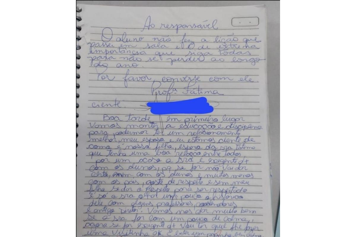 Uma professora de São Paulo enviou um bilhete para os pais de um aluno pontuando que ele não havia feito a atividade proposta em aula e pedia para que os responsáveis conversassem com o menino. “É de extrema importância que siga todas as atividades para não se perder ao longo do ano. Por favor, converse com ele”, pediu.
