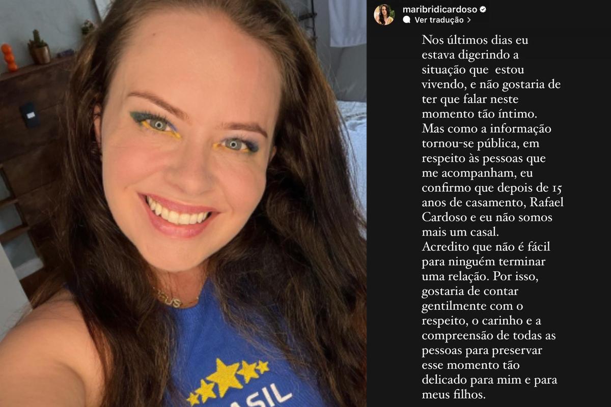 Na sessão de stories da plataforma Instagram, a ex-mulher de Rafael se pronunciou sobre o divórcio. “Nos últimos dias eu estava digerindo a situação que estou vivendo e não gostaria de ter que falar neste momento tão íntimo. Mas como a informação tornou-se pública, em respeito às pessoas que me acompanham, eu confirmo que depois de 15 anos de casamento, Rafael Cardoso e eu não somos mais um casal. Acredito que não é fácil para ninguém terminar uma relação. Por isso, gostaria de contar gentilmente com o respeito, o carinho e a compreensão de todas as pessoas para preservar esse momento tão delicado para mim e para meus filhos”, escreveu Mariana.