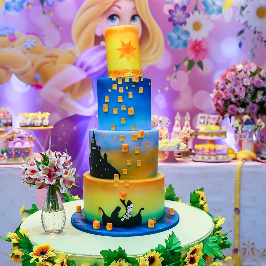 O tema escolhido foi o desenho da Disney “Enrolados”. A decoração da festa foi tomada pelo cor-de-rosa e roxo, com diversas imagens da personagem principal do filme, Rapunzel, e muitas flores.
