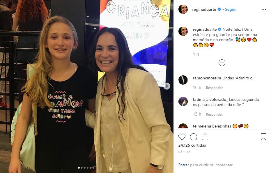 No Instagram, Regina publicou fotos da noite de estreia da neta, na peça chamada “Cadê a Criança que Tava Aqui?”. “Noite feliz! Uma estreia é pra guardar pra sempre na memória e no coração”, declarou Regina. Manuela, de 13 anos, é filha de Gabriela Duarte, que também é mãe de Frederico, de 7 anos. Ambos são frutos do relacionamento da atriz com o fotógrafo Jairo Goldfuss.