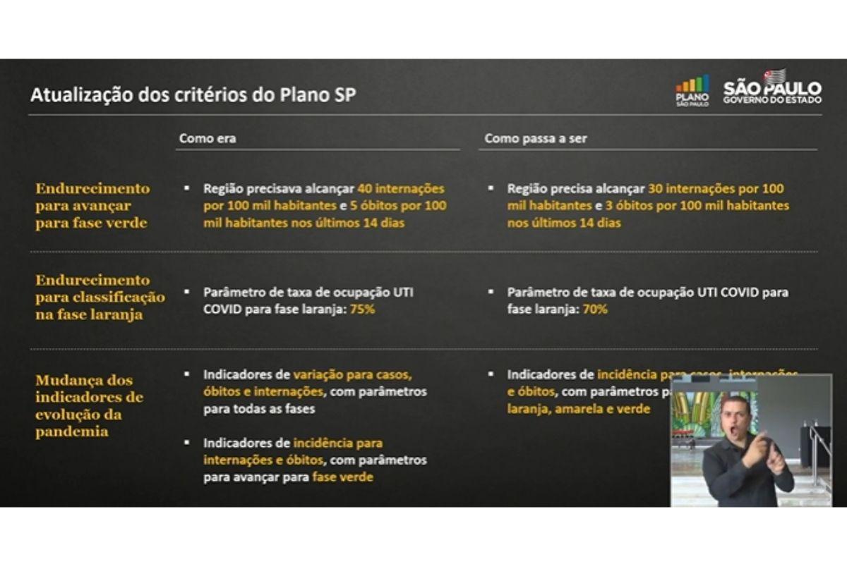 Para avançar para a fase verde, será necessário agora que os municípios alcancem 30 internações por 100 mil habitantes e 3 óbitos por 100 mil habitantes nos últimos 14 dias. Já para a classificação na fase laranja, o parâmetro será medido a partir das taxas de ocupação UTI Covid, sendo necessário alcançar 70%.