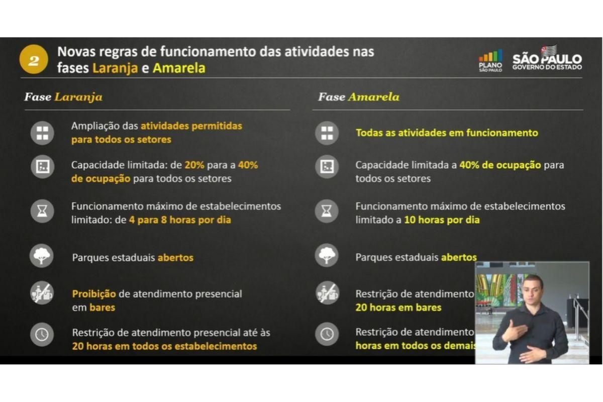 Com as novas regras, também houve alterações no funcionamento das atividades das fases laranja e amarela em relação à economia. Na fase laranja, haverá a ampliação das atividades permitidas em todos os setores, com capacidade aumentada de 20% para 40% de ocupação. O funcionamento máximo foi limitado de 4 para 8 horas por dias e os parques estaduais poderão funcionar. No entanto, o atendimento presencial em bares está proibido, além da restrição até às 20 horas nos estabelecimentos de atendimento presenciais.