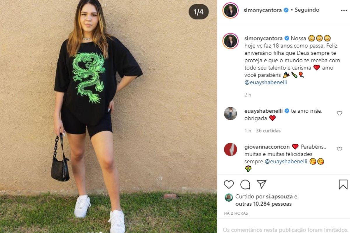 Simony usou as redes sociais nesta quinta-feira, 13 de maio, para fazer uma homenagem à filha, Aysha, que completa 18 anos. Para celebrar a data, a cantora compartilhou uma série de fotos da filha, algumas antigas, de quando ela era criança e outras mais atuais. Na legenda da publicação, a mãe se declarou para a garota e se surpreendeu com a rápida passagem dos anos.