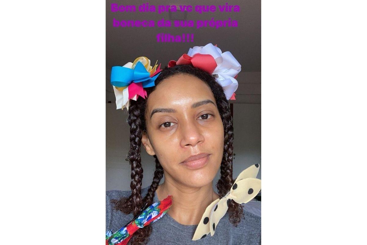 A atriz aparece de cara limpa exibindo as tranças e os laços coloridos no cabelo escolhidos pela menina para renovar o visual da mãe. “Bom dia pra você que vira boneca da sua própria filha”, brincou Taís na legenda do post publicado no stories.