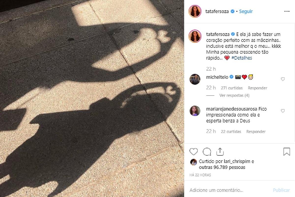 Tatá Fersoza, mãe de Melinda e Theodoro, se impressionou com uma habilidade da filha de fazer imagens com a mão. Ela usou o Instagram para mostrar o quão orgulhosa estava da menina. No domingo, 30 de junho, Thais publicou a sombra da menina fazendo coração.