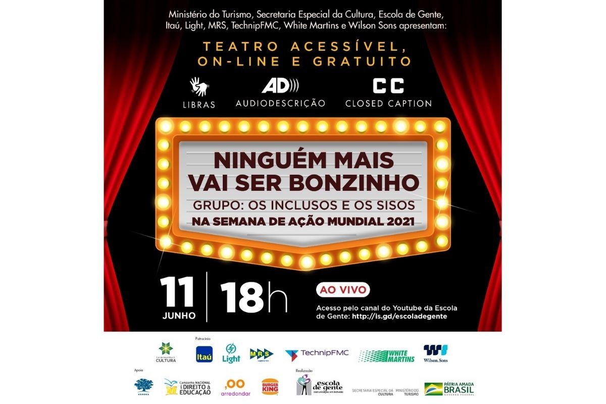 A apresentação do grupo “Os Inclusos e os Sisos” integra o projeto da 3ª Mostra de Teatro Acessível, que conta com o patrocínio do Itaú, Light, MRS, TechnipFMC, White Martins e Wilson Sons, além do apoio da Ashoka, Campanha, Arredondar e Burger King.