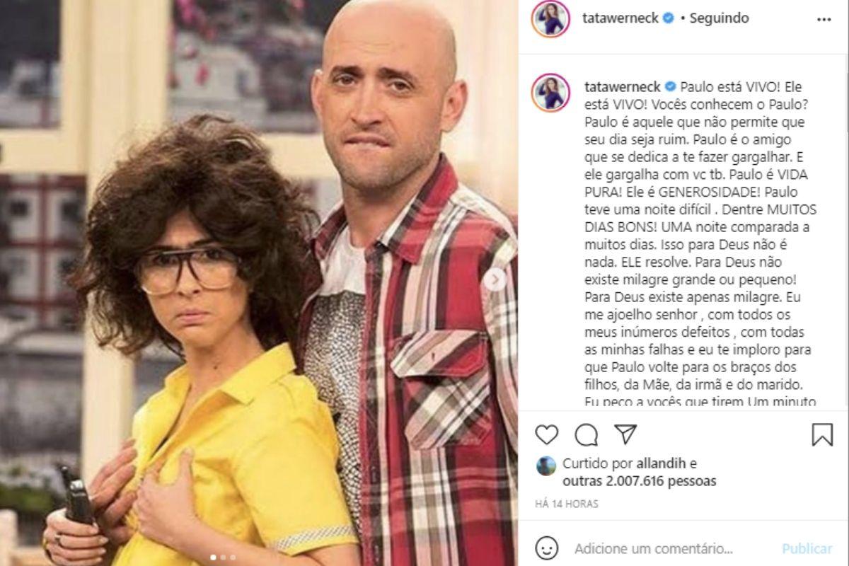 Tatá ainda falou sobre a importância da fá durante os momentos difíceis. “Dentre MUITOS DIAS BONS! UMA noite comparada a muitos dias. Isso para Deus não é nada. ELE resolve. Para Deus não existe milagre grande ou pequeno! Para Deus existe apenas milagre. Eu me ajoelho senhor , com todos os meus inúmeros defeitos , com todas as minhas falhas e eu te imploro para que Paulo volte para os braços dos filhos, da Mãe, da irmã e do marido”, continuou.
