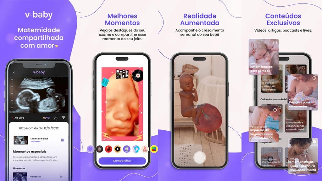 O grande diferencial do V-Baby está no seu aplicativo gratuito, integrado diretamente ao sistema das clínicas. Com ajuda da inteligência artificial, a plataforma identifica os momentos mais importantes do ultrassom, como os batimentos cardíacos, os movimentos, as expressões e até as imagens em 4D do bebê.