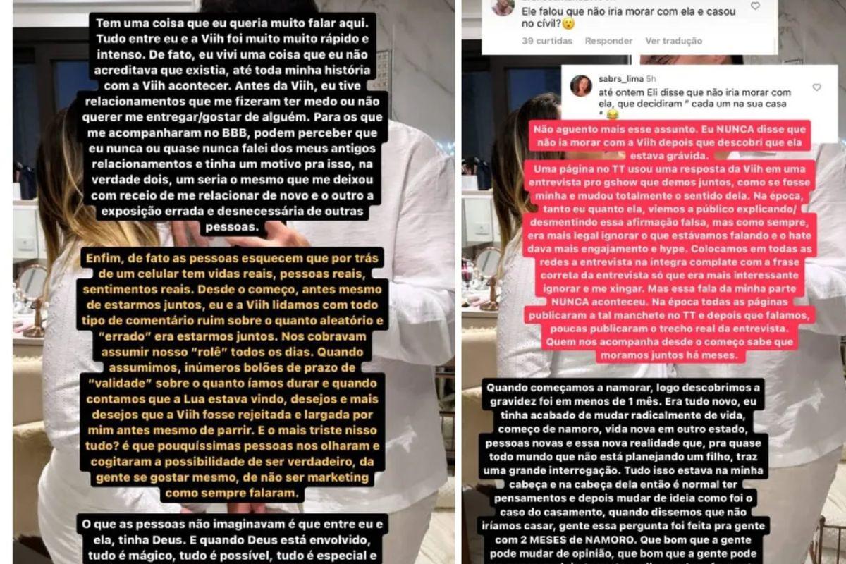 Ele também disse que desde que ele a influenciadora começaram a namorar, muitas cobranças foram feitas por parte dos seguidores. “Quando assumimos, inúmeros bolões de prazo de ‘validade’ sobre o quanto íamos durar. E quando contamos que a Lua estava vindo, desejos que a Viih fosse largada e rejeitada por mim antes mesmo de parir. O mais triste disso tudo? Pouquíssimas pessoas nos olharam e cogitaram a possibilidade de ser verdadeiro”, seguiu ele.