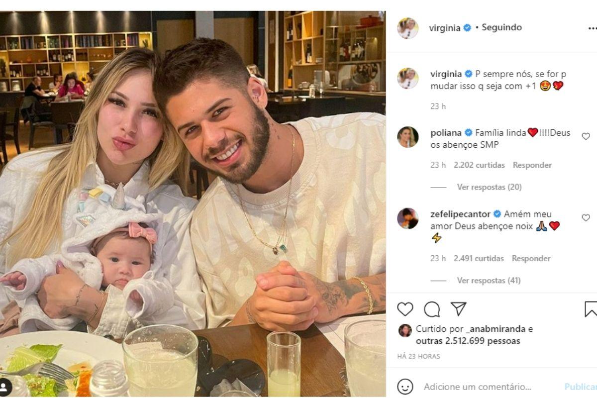 Os internautas amaram a publicação e logo começaram a comentar. “Aiiiii Virgínia… Maria Alice tá muito linda”, escreveu Sabrina Sato. “Família linda!”, elogiou uma seguidora. “Eu amo vocês três!”, se declarou outra. “Ela é cuspida e escarrada ele”, escreveu uma terceira, falando sobre as semelhanças entre Maria Alice e Zé Felipe. Veja a publicação abaixo: