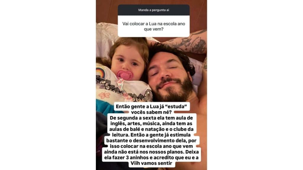 Eliezer destacou que, por Lua já ter uma rotina educacional ativa, a matrícula formal na escola ainda não é prioridade. A intenção é aguardar até que a filha complete três anos, em abril de 2026, momento em que eles planejam reavaliar a necessidade de inseri-la na escolinha.
