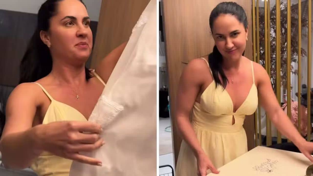 “Chegou a roupa do batizado! Eu ainda não abri. Vou dar uma olhadinha junto com vocês… Ah! Gente, meu Deus… que joia! Vocês não têm noção do que tem aqui. Ó, esse aqui é o que ela vai usar mesmo. Ah, as frases… nossa, ficou muito delicada”, disse, encantada.