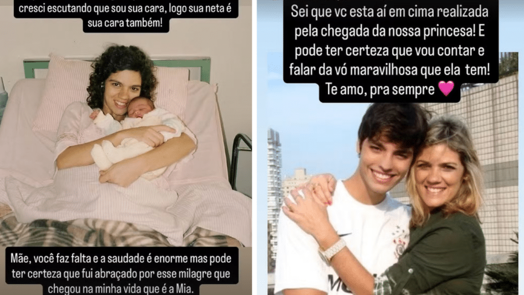 O influenciador também compartilhou uma montagem com fotos dele e da filha ainda bebês, destacando as semelhanças entre os dois. “Sei que você está aí em cima realizada pela chegada da nossa princesa! E pode ter certeza que vou contar e falar da avó maravilhosa que ela tem! Te amo pra sempre”, escreveu.