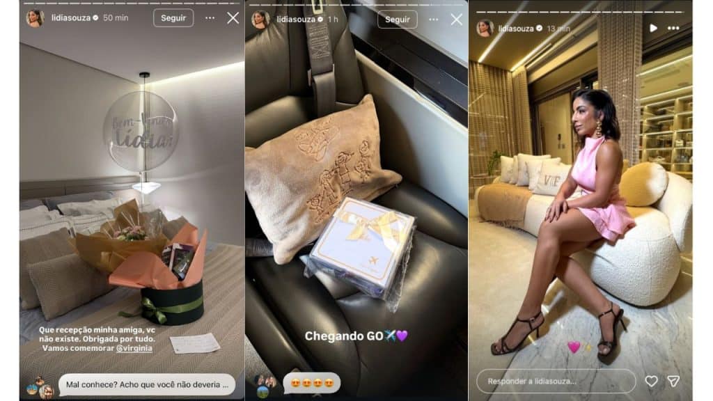 Assim que chegou à capital goiana, Lídia exibiu em seus stories a recepção de luxo preparada por Virginia. No quarto reservado para ela, havia um arranjo de flores, cesta de chocolates e balão personalizado, acompanhados de uma mensagem escrita à mão pela anfitriã: “Hoje é dia de festa! Sinta-se em casa, mas você já é! Espero que goste, com amor, Virginia.” A publicitária respondeu emocionada: “Que recepção, minha amiga! Você não existe. Obrigada por tudo. Vamos comemorar, Virginia.”