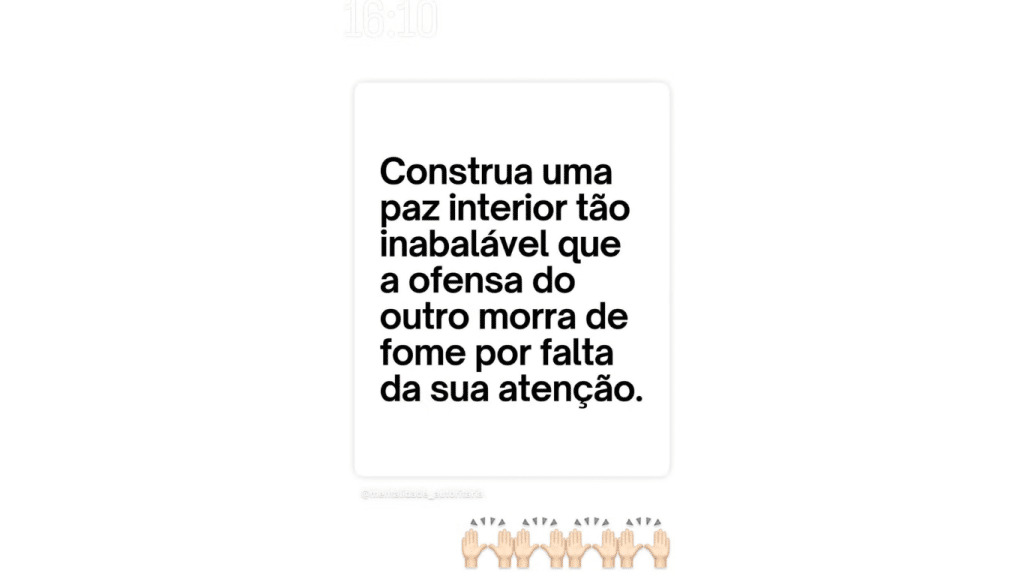 Nos Stories do Instagram, a influenciadora republicou a frase: “Construa uma paz interior tão inabalável que a ofensa do outro morra de fome por falta da sua atenção”.
