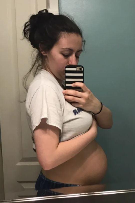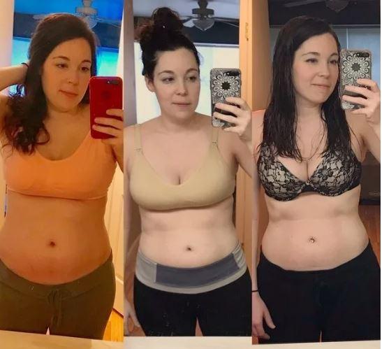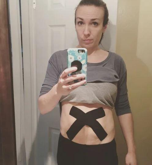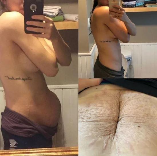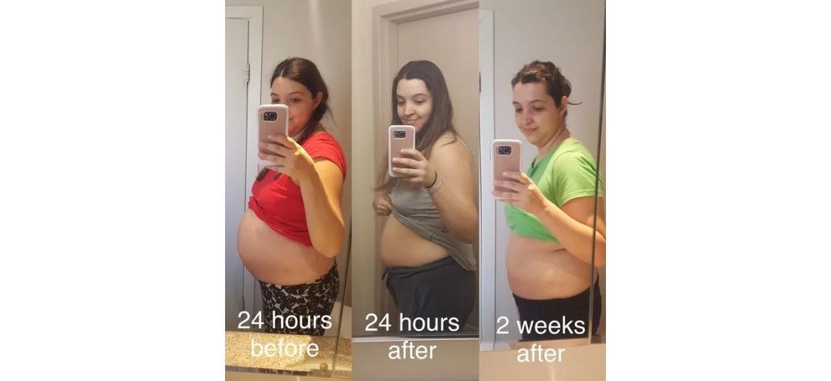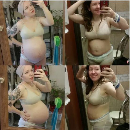 “As fotos da esquerda foram tiradas dois dias antes da minha cesariana. As da direita foram tiradas dois dias depois. Parecia que tinham costurado meu estômago e meus peitos eram fontes intensas de leite”.