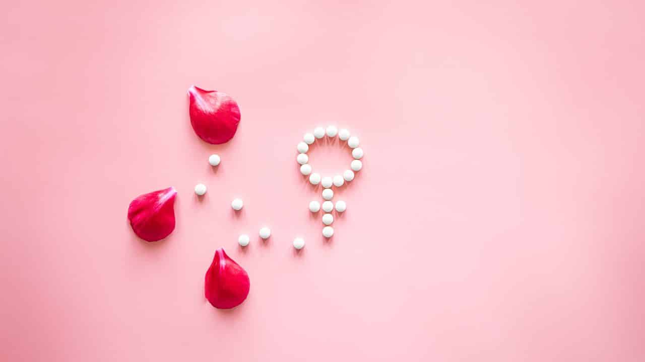 Símbolo feminino ao lado de pétalas de rosa, representando a progesterona na gravidez.