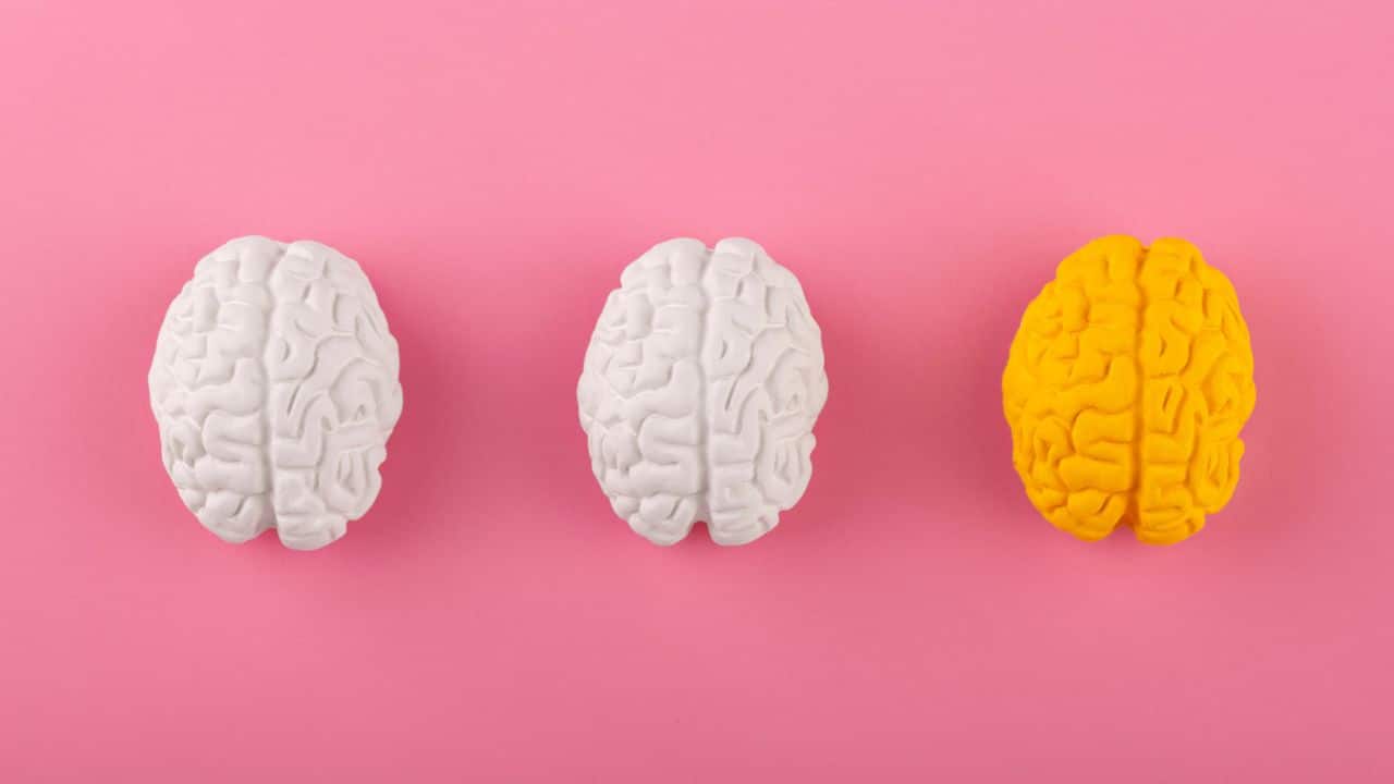 Cérebro amarelo ao lado de cérebros brancos em um fundo rosa.