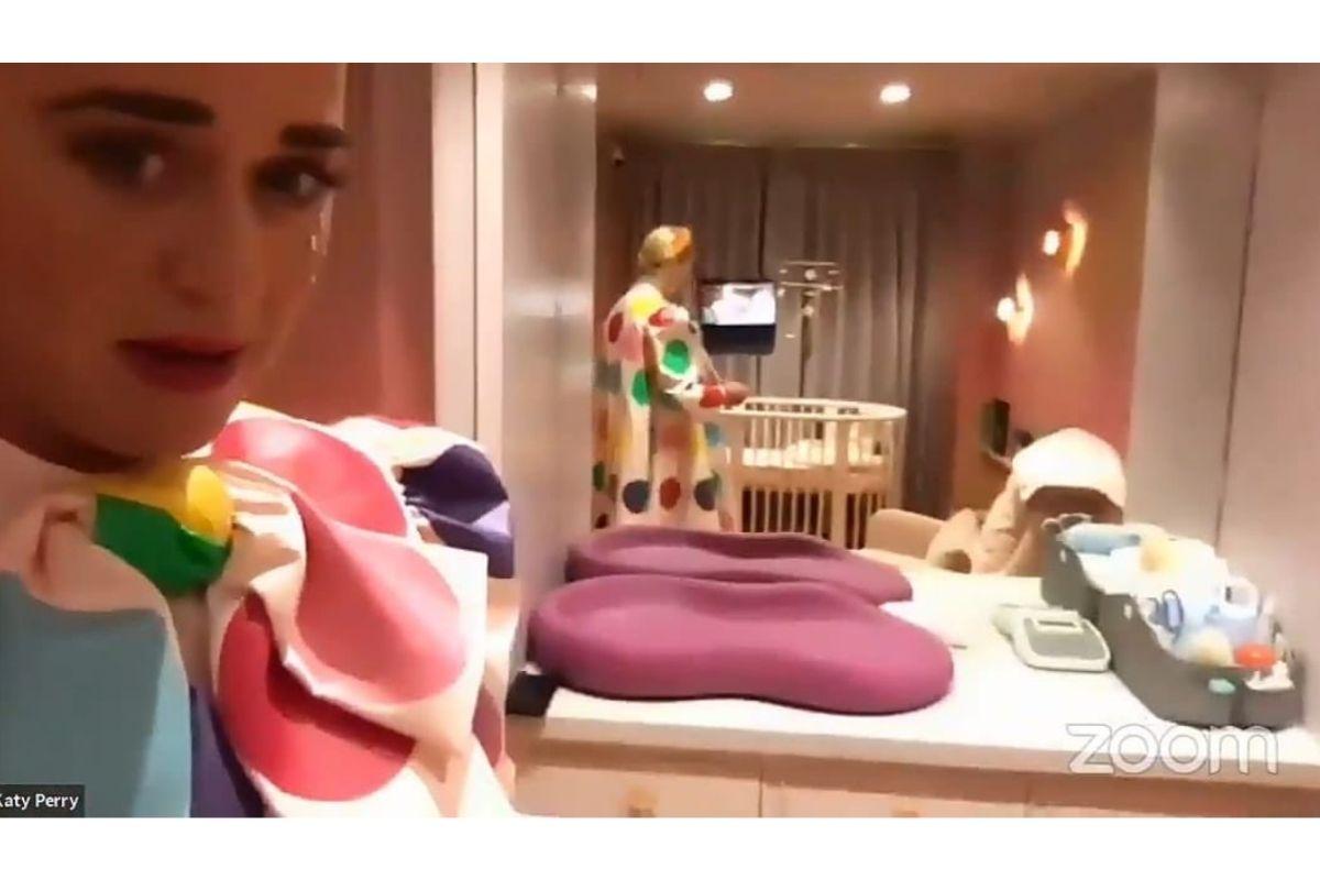 Durante o “tour”, Katy explicou as escolhas: “Então, eu tenho algumas roupas na parede!”. No ambiente, é possível ver detalhes em cinza e rosa e uma luminária no formato de um hexágono. Próximo a parede, a cantora apostou em um berço branco e também uma roupa inspirada no primeiro sucesso musical, “I Kissed A Girl”.