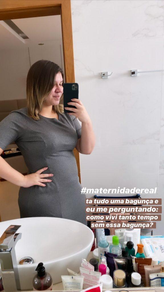 Com um vestido cinza, Marilia tirou uma foto em frente ao espelho do banheiro e escreveu: “Está tudo uma bagunça e eu me perguntando: como vivi tanto tempo sem essa bagunça?”, escreveu na publicação além de acrescentar a hashtag “maternidade real”.