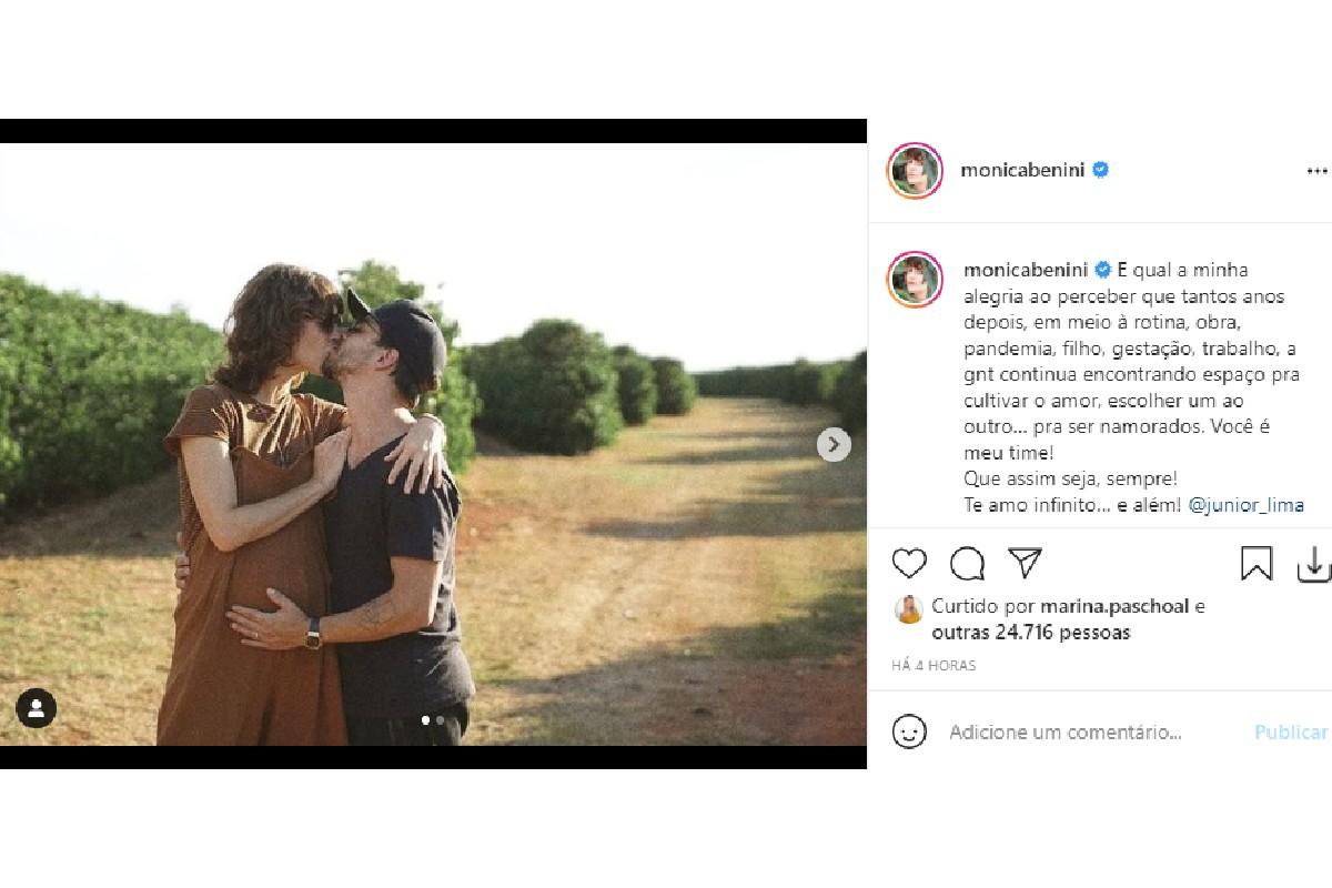 No dia 12 de junho, Mônica compartilhou duas fotos ao lado do marido e fez uma homenagem sobre a parceria de anos que os dois tem juntos. “E qual a minha alegria ao perceber que tantos anos depois, em meio à rotina, obra, pandemia, filho, gestação, trabalho, a gente continua encontrando espaço pra cultivar o amor, escolher um ao outro… pra ser namorados. Você é meu time! Que assim seja, sempre! Te amo infinito… e além!”, disse.