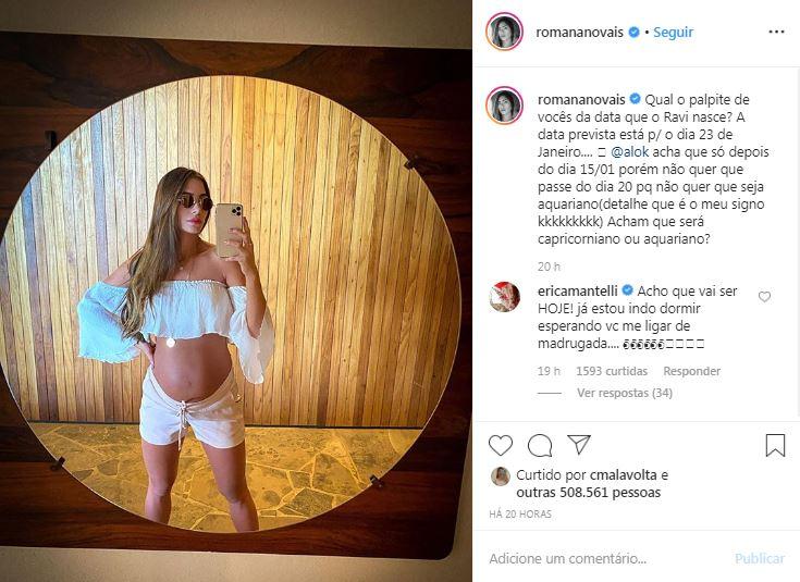 Romana Novais está muito ansiosa para a chegada do primeiro filho. Na segunda-feira, 6 de janeiro, a modelo publicou uma foto em seu Instagram para fazer uma brincadeira com os seguidores. Na legenda da publicação, Romana incentivou os seguidores a falarem qual será a data de nascimento de Ravi.