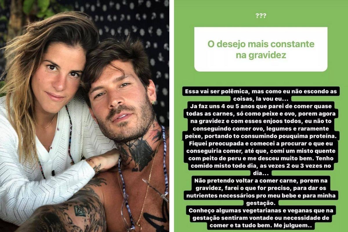 A influencer contou que parou de comer ‘quase todas as carnes’ há mais ou menos 4 ou 5 anos. “Essa vai ser polêmica, mas como eu não escondo as coisas, lá vou eu… Já faz uns 4 ou 5 anos que parei de comer quase todas as carnes, só peixe e ovo. Porém, agora, na gravidez e com esses enjoos todos, eu não estou conseguindo comer ovo, legumes e raramente peixe, portanto estou consumindo pouquíssima proteína”, explicou.
