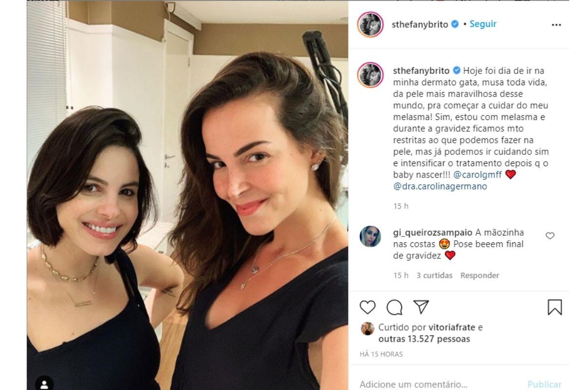 Nesta última quarta-feira, 16 de setembro, Sthefany Brito, 33 anos de idade, usou o Instagram para compartilhar as mudanças da gestação. A atriz disse que está realizando procedimentos estéticos durante a gravidez, pois está com manchas escuras na pele, causada por uma condição chamada melasma, que ocorre durante a gestação em algumas mulheres.