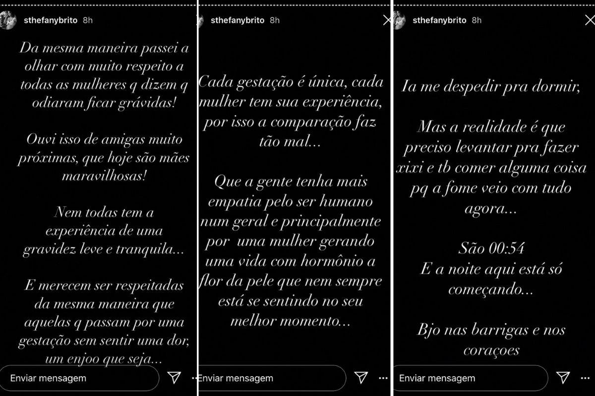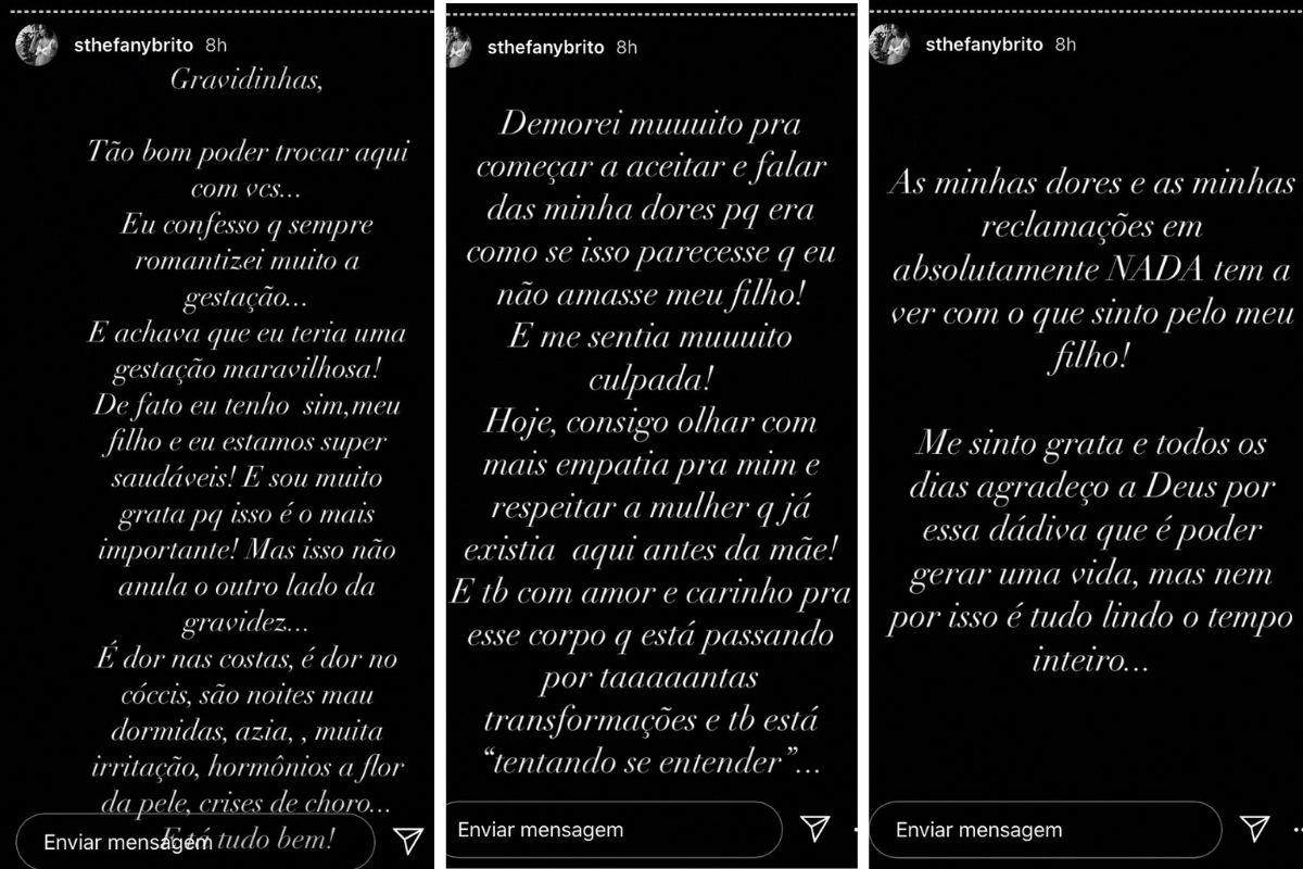 Sthefany abriu o jogo sobre o lado romantizado da gestação e falou sobre as dores. “Demorei muito pra começar a aceitar e falar das minhas dores, porque era como se isso parecesse que eu não amasse meu filho. E me sentia muito culpada. Hoje, consigo olhar com mais empatia para mim e respeitar a mulher que já existia aqui antes da mãe. E também com amor e carinho para esse corpo que está passando por tantas transformações e também está ‘tentando se entender’”, escreveu no post dos Stories.