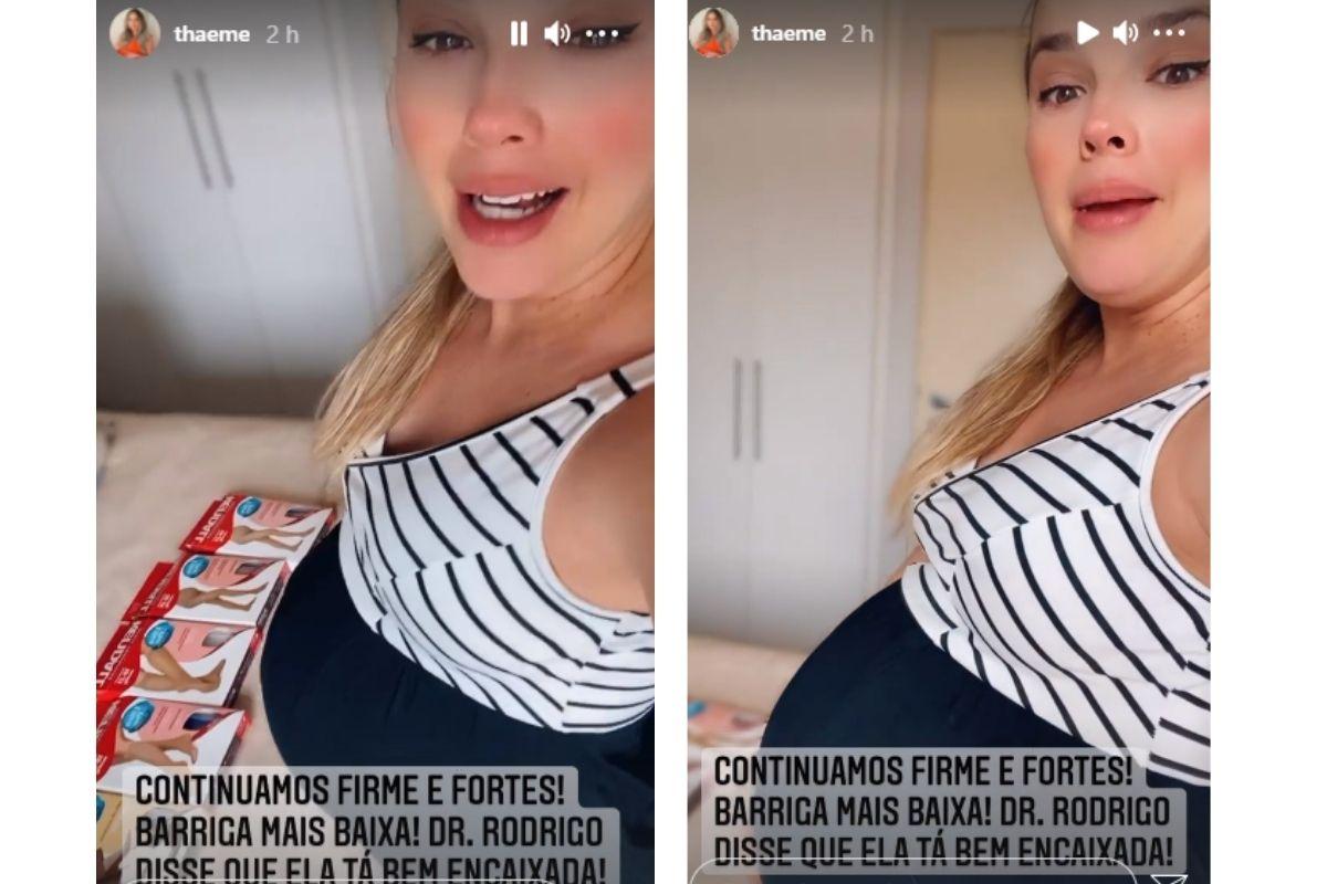 Por meio dos Stories do Instagram, Thaeme mostrou a barriga e contou que ela já está mais baixa. “Continuamos por aqui. Barriga mais baixa agora. Dr. Rodrigo até falou que ela está bem encaixada, por sinal. Então qualquer hora é hora”, disse.