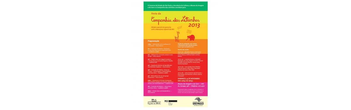No dia 24 de novembro, domingo, a Companhia das Letrinhas promoverá, em parceria com o MIS – Museu de Imagem e Som de São Paulo, a Festa da Companhia das Letrinhas, que é o selo de livros infantis da Companhia das Letras. O evento terá ampla programação cultural, entre elas as brincadeiras para as crianças, contações de histórias, sessões de autógrafos e, além disso, os livros estarão com descontos de até 25%.