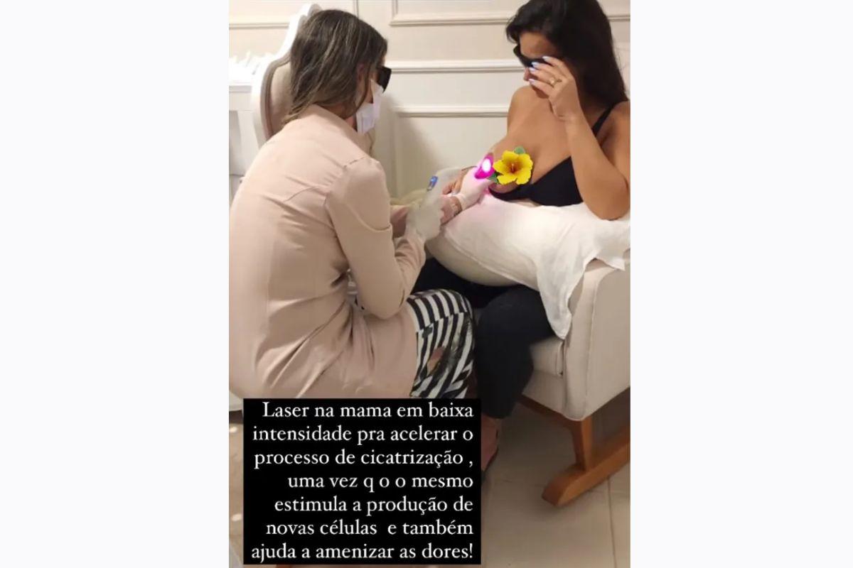 Em outro momento, Viviane também apareceu realizando um tratamento a laser em seus seios. “Laser na mama em baixa intensidade para acelerar o processo de cicatrização, uma vez que o mesmo estimula a produção de novas células e também ajuda a amenizar as dores”, acrescentou.