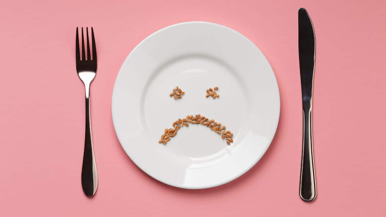 Prato com grãos formando uma carinha triste, acompanhado por garfo e faca em um fundo rosa, simbolizando a alergia alimentar.